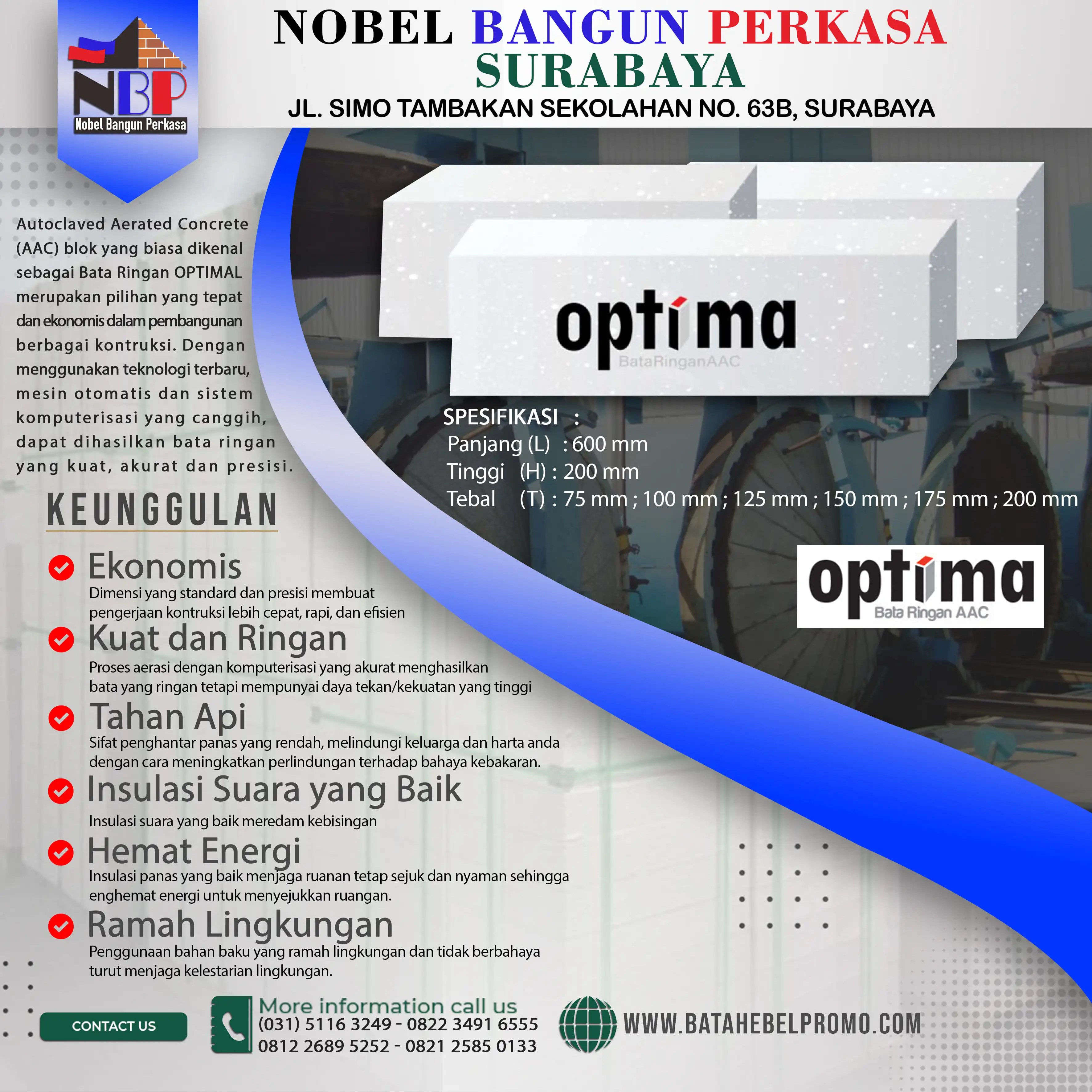 Bata ringan hebel Optima merupakan merk bata hebel yang diproduksi oleh PT. Santoso Gema Bahagia yang berlokasi di Beji Pasuruan dan didistribusikan oleh CV. Nobel Bangun Perkasa.