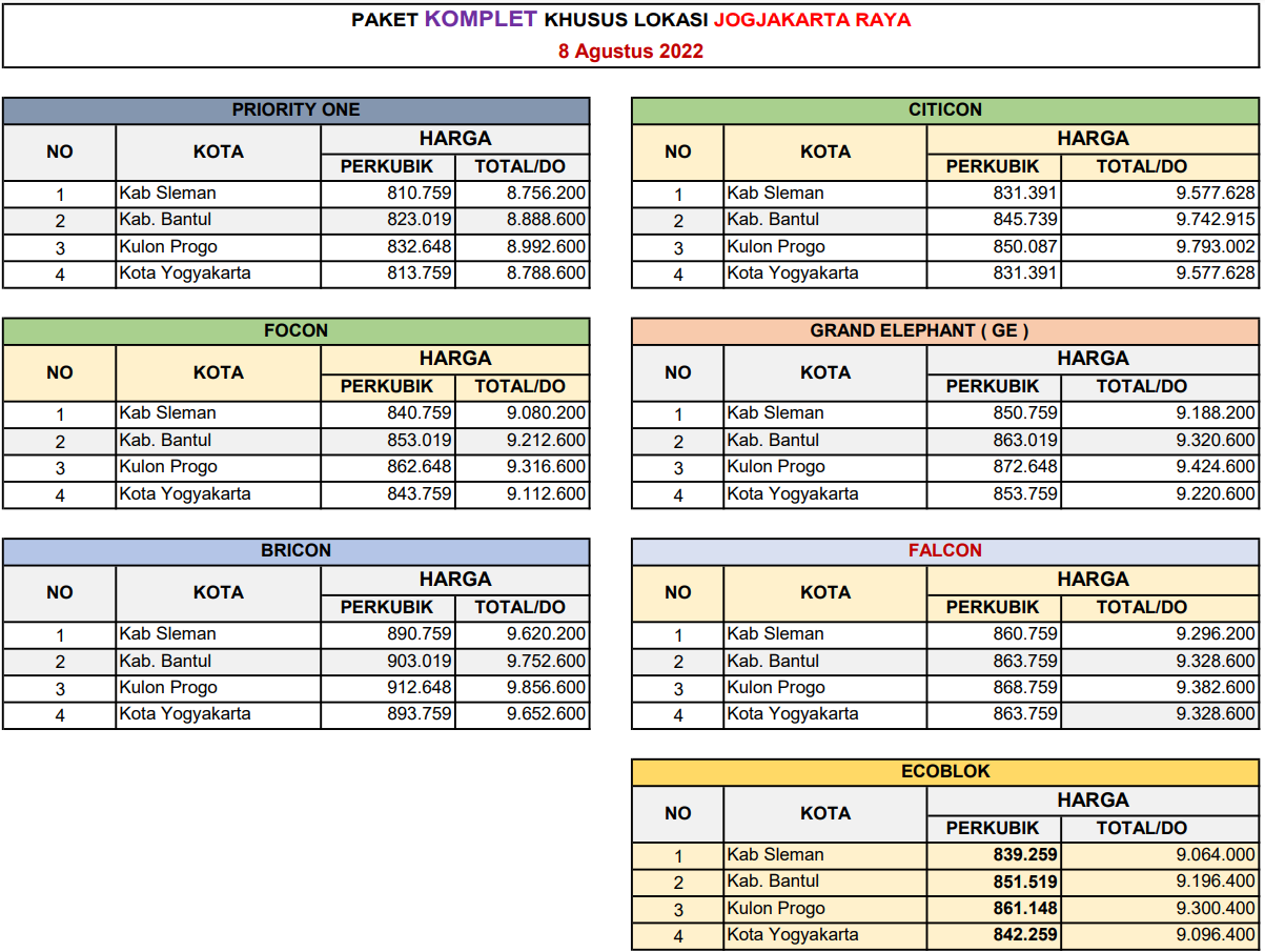 Harga diatas hanya berlaku di area Kota Yogyakarta, Bantul, Sleman, Kulon Progo. Minimum pembelian bata hebel diatas adalah 10,8 M3 (khusus merk Citicon 11,52 M3).